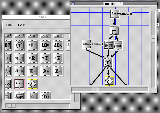 space.The right hand window is of course one of the editting windows illustrating the general style. Challenge question for the bored : given that T is the standard Toffoli gate - in permutation notation it is ([110][111]) - what is the distribution of observations as produced by the measurement at the bottom?
